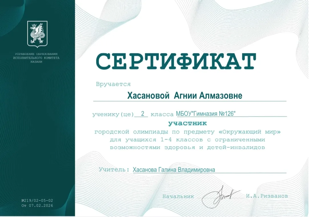 Поздравляем ученицу 2В класса Хасанову Агнию! Она приняла участие в олимпиаде по предмету «Окружающий мир» для учащихся 1–4 классов с ограниченными возможностями здоровья и детей‑инвалидов. Участие в олимпиаде — это не просто проверка знаний, а настоящий подвиг: нужно преодолеть волнение, собраться с силами и показать всё, на что ты способен. Агния справилась с этой задачей с достоинством! Мы гордимся тобой, Агния! Пусть каждый новый день приносит тебе радость познания, а поддержка близких и педагогов помогает идти вперёд.