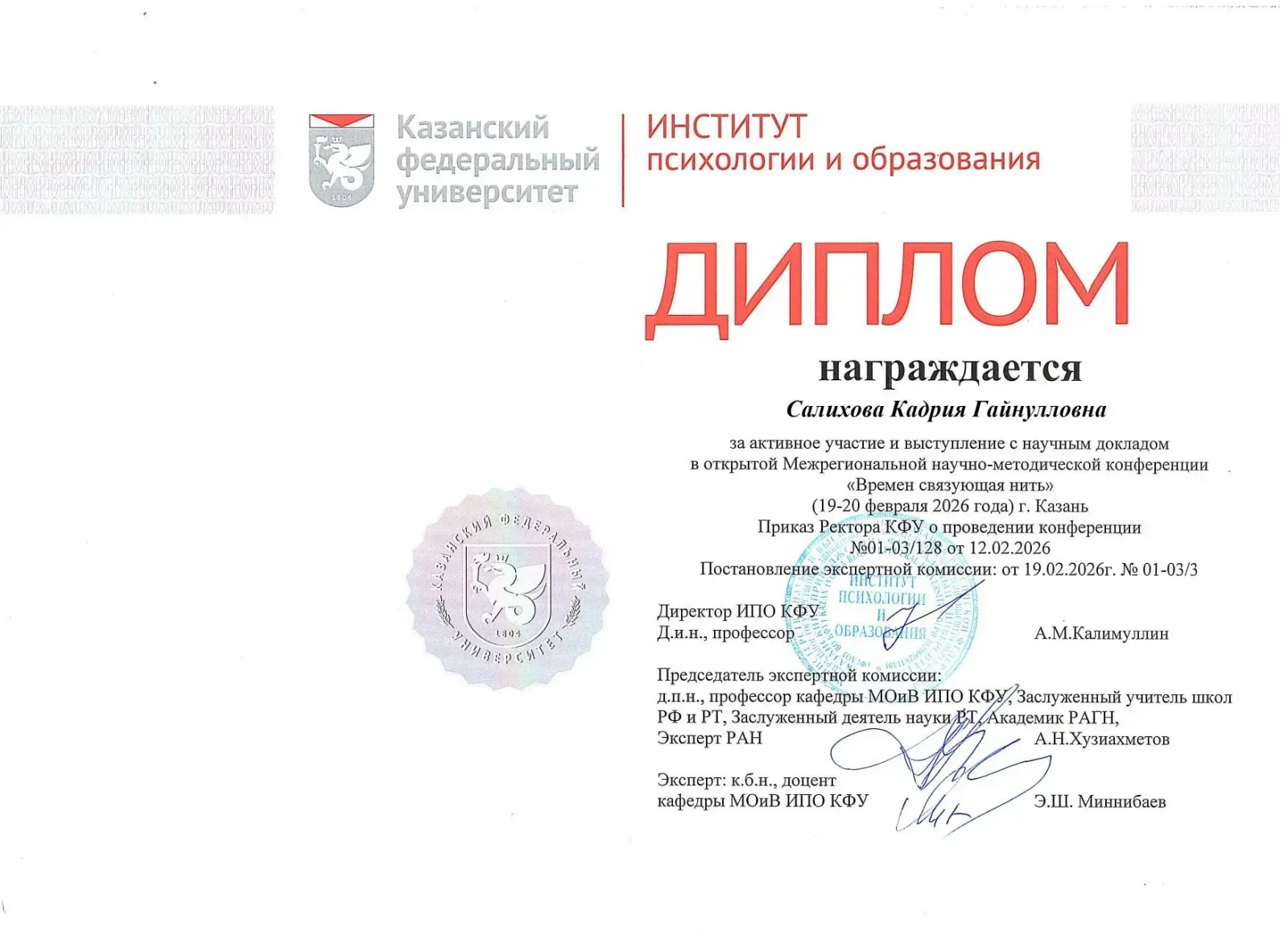 Поздравляем учителя начальных классов ✨Салихову Кадрию Гайнулловну с получением диплома на открытой межрегиональной научно‑практической конференции «Времен связующая нить»! Участие и доклад на таком уровне — это не только признание профессионализма, но и важный вклад в обмен опытом между педагогами разных регионов. Желаем дальнейших успехов и новых побед!