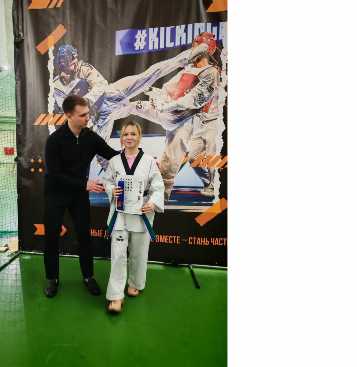 Она занимается тхэквондо, была аттестация и получила - VII пояс и VII диплом .