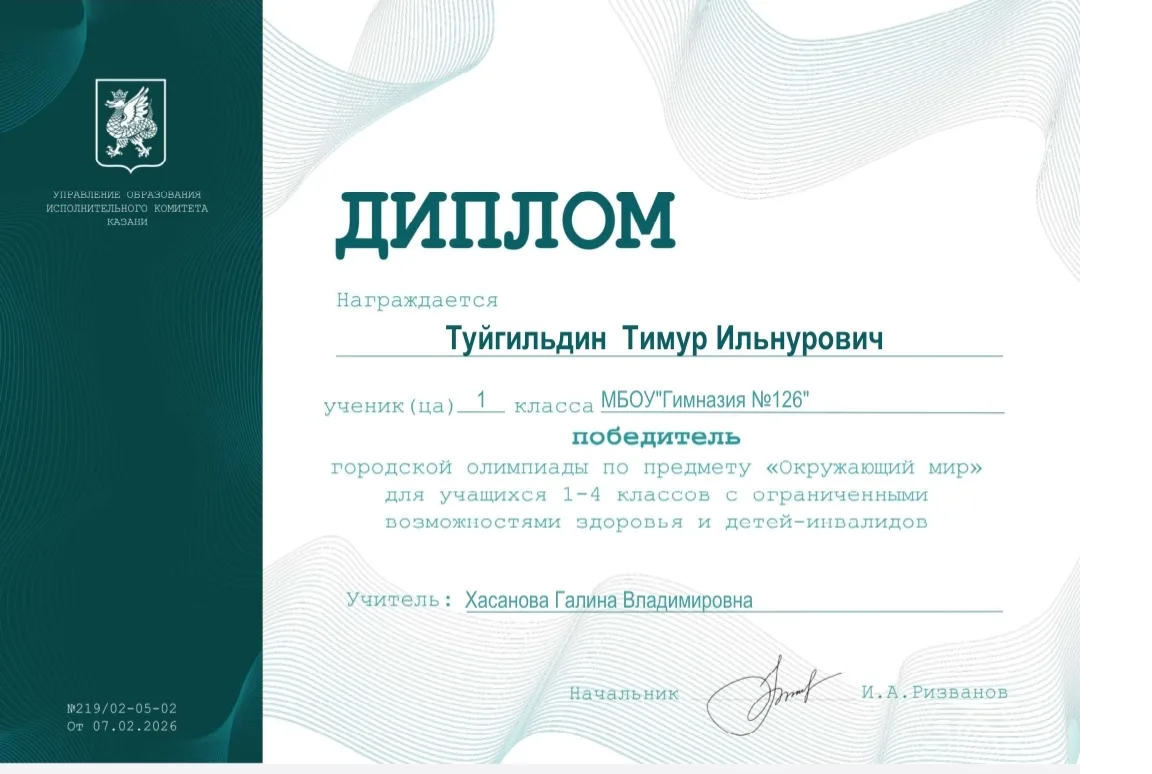 От всего сердца поздравляем Туйгильдина Тимура , ученика 1 В класса, с победой в олимпиаде по окружающему миру для учащихся 1–4 классов для детей с ограниченными возможностями здоровья и детей‑инвалидов. 1 место! Тимур, ты настоящий герой! Твоя целеустремлённость, любознательность и смелость восхищают. Победа в такой серьёзной олимпиаде — это огромный труд и заслуженное достижение. Ты показал всем нам, что главное — верить в себя и не бояться испытаний.