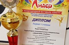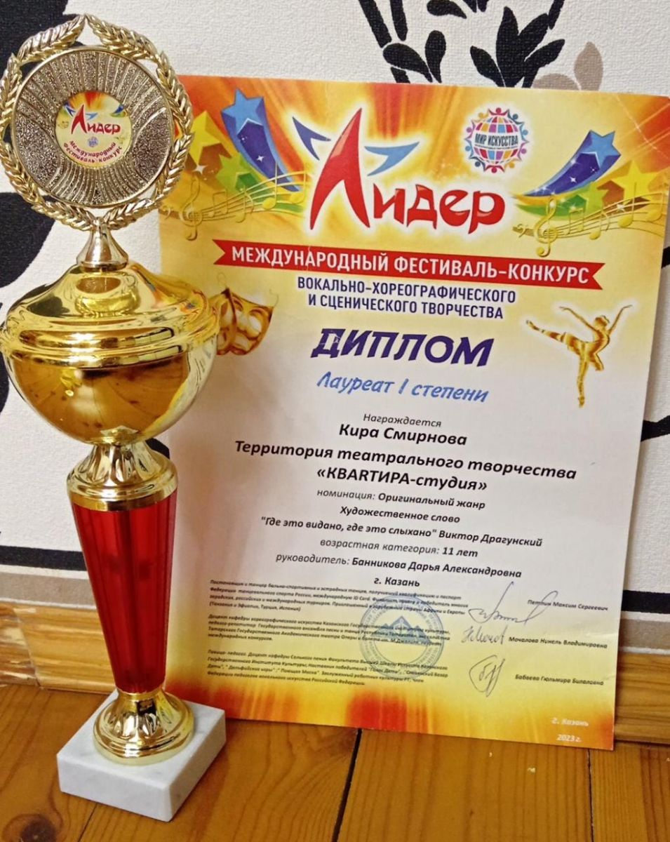 Поздравляем ученицу 4 Б класса Смирнову Киру с победой! Диплом I степени в Международном фестивале-конкурсе вокально-хореографического и сценического творчества "Лидер". Номинация :художественное слово. Благодарим за подготовку руководителя Банникову Дарью Александровну. Желаем дальнейших успехов и побед.