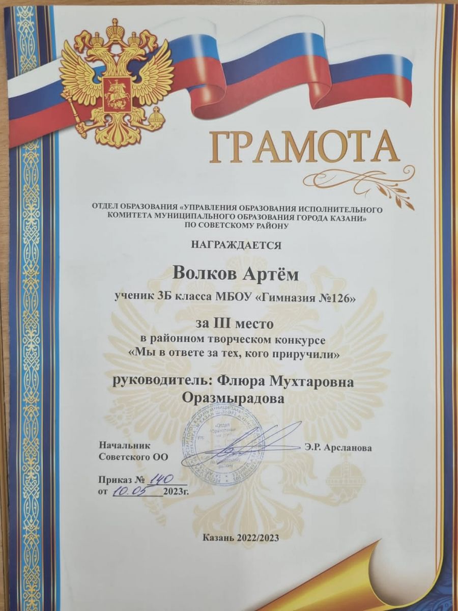 Поздравляем ученика 3Б класса Волкова Артема. III место в районном творческом конкурсе "Мы в ответе за тех, кого приручили". Благодарим за подготовку учителя начальных классов Оразмырадову Флюру Мухтаровну. Желаем дальнейших успехов и побед.