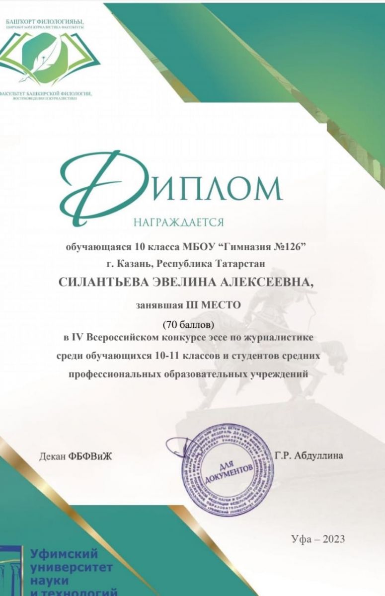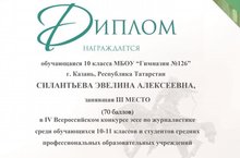 Поздравляем ученицу 10 А класса, Силантьеву Эвелину. III место в IV Всероссийском конкурсе эссе по журналистике среди обучающихся 10-11 классов. Желаем дальнейших успехов и творческих побед.