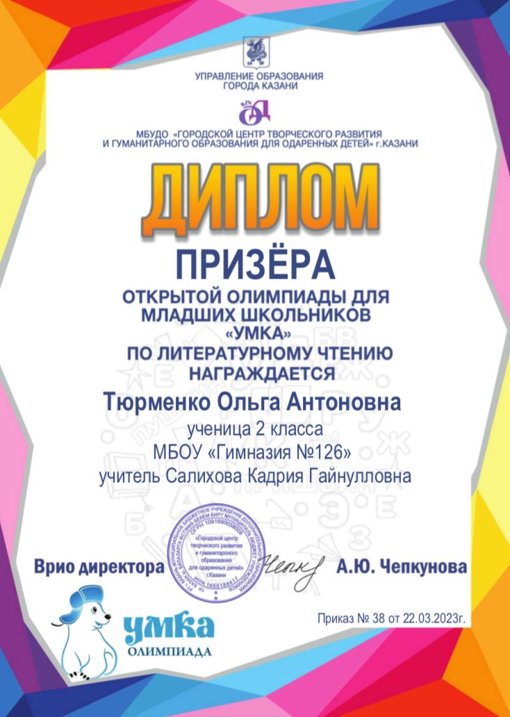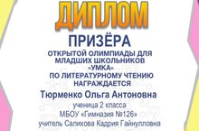 Поздравляем ученицу 2 А класса Тюрменко Ольгу. Она призёр открытой олимпиады для младших школьников "Умка" по литературному чтению. Благодарим за подготовку Салихову Кадрию Гайнулловну, учителя начальных классов. Желаем дальнейших успехов и побед.
