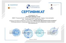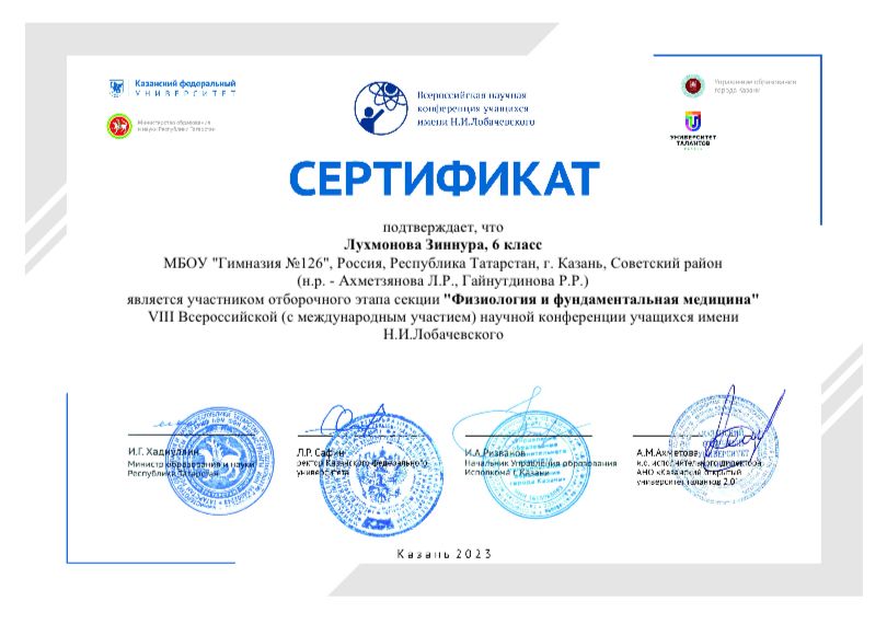 Поздравляем ученицу 6 А класса, Лухмонову Зиннуру. Она участник отборочного этапа секции "Физиология и фундаментальная медицина" НПК им.Н.И.Лобачевского. Благодарим за подготовку Ахметзянову Ляйсан Радиковну, учителя биологии, Гайнутдинову Резеду Рафаилевну, учителя биологии. Желаем дальнейших успехов и побед.