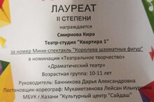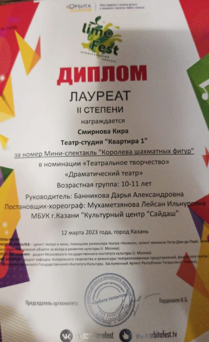Поздравляем ученицу 4 Б класса, Смирнову Киру. Она победитель Международного фестиваля Lime Fest II место в номинации "Театральное творчество", за номер Мини-спектакль "Королева шахматных фигур". Благодарим за подготовку руководителя Банникову Дарью Александровну, хореографа - постановщика Мухаметзянов у Ляйсан Ильнуровну. Желаем дальнейших успехов и творческих побед.