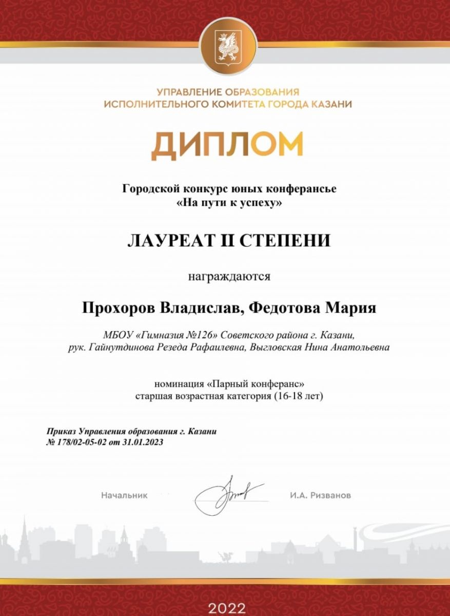 Поздравляем учащихся 10А класса, Прохорова Владислава и Федотову Марию с победой! II место в номинации "Парный конферанс". Они участники городского конкурса юных конферансье "На пути к успеху". Благодарим руководителей: Выгловскую Нину Анатольевну, Гайнутдинову Резеду Рафаилевну за подготовку. Желаем дальнейших успехов и творческих побед.