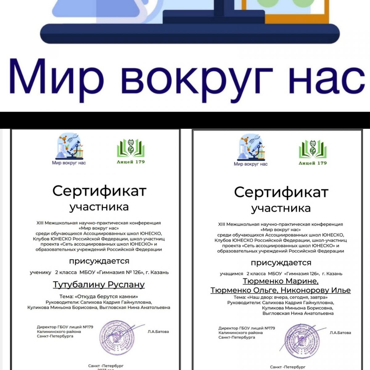 Поздравляем учеников 2 А класса: Тутубалина Руслана, Тюрменко Олю, Тюрменко Марину, Никонорова Илью. Они участники межшкольной научно - практической конференции начальной школы "Мир вокруг нас", которая проходила в городе Санкт-Петербурге. Всего для участия в заочном туре было подано 360 заявок из 35 регионов Российской Федерации. Все работы наших учеников отмечены сертификатами. Поздравляем и желаем дальнейших успехов, научных открытий и побед.