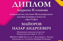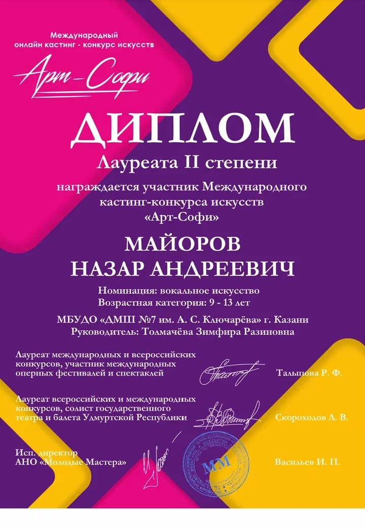 Поздравляем нашего талантливого ученика 3Б класса Майорова Назара. В возрастной номинации 9-13 лет Назар стал единственным Лауреатом II степени. I степень не присуждали вообще. Члены жюри Вокалисты-солисты оперных театров. Благодарим преподавателя ДМШ №7 Толмачеву Земфиру Разиновну. Желаем дальнейших успехов и побед.