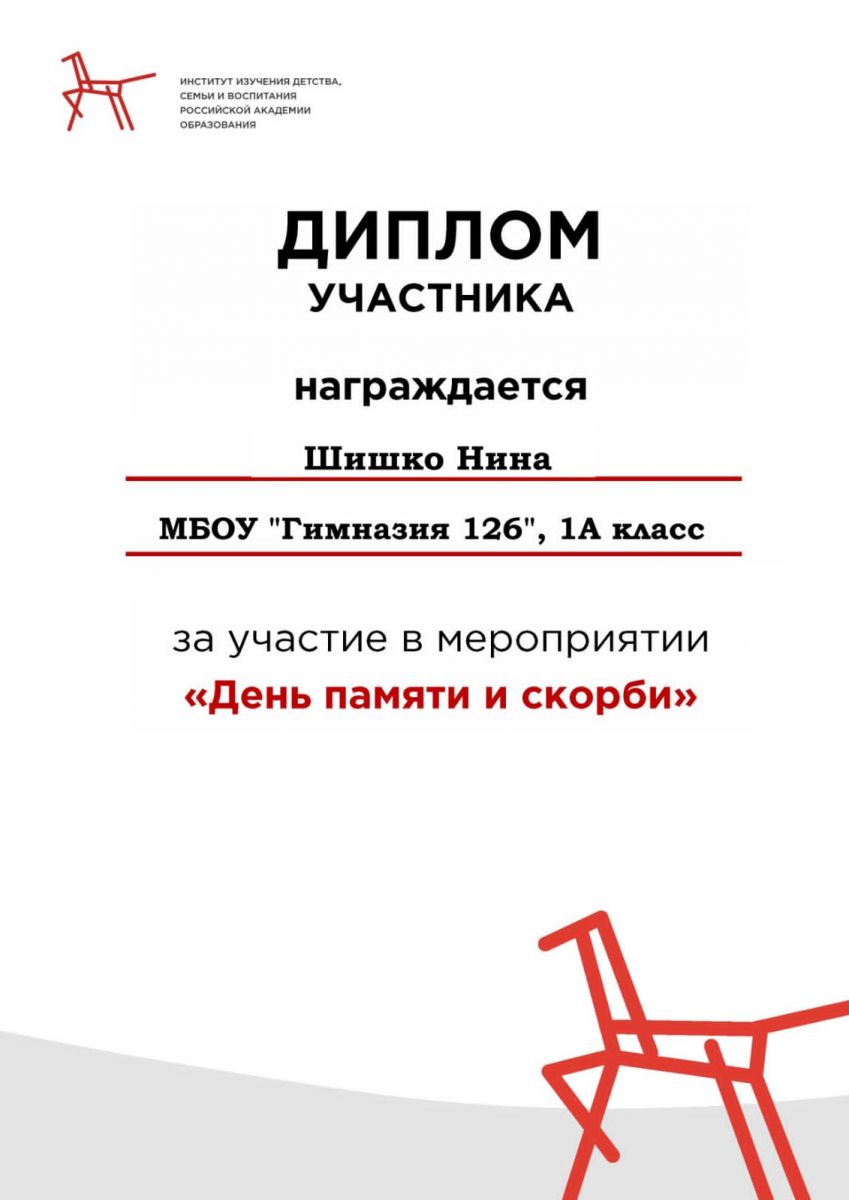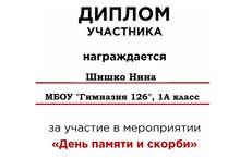 Поздравляем и благодарим ученицу 1 А класса Шишко Нину за участие в мероприятии "День памяти и скорби"