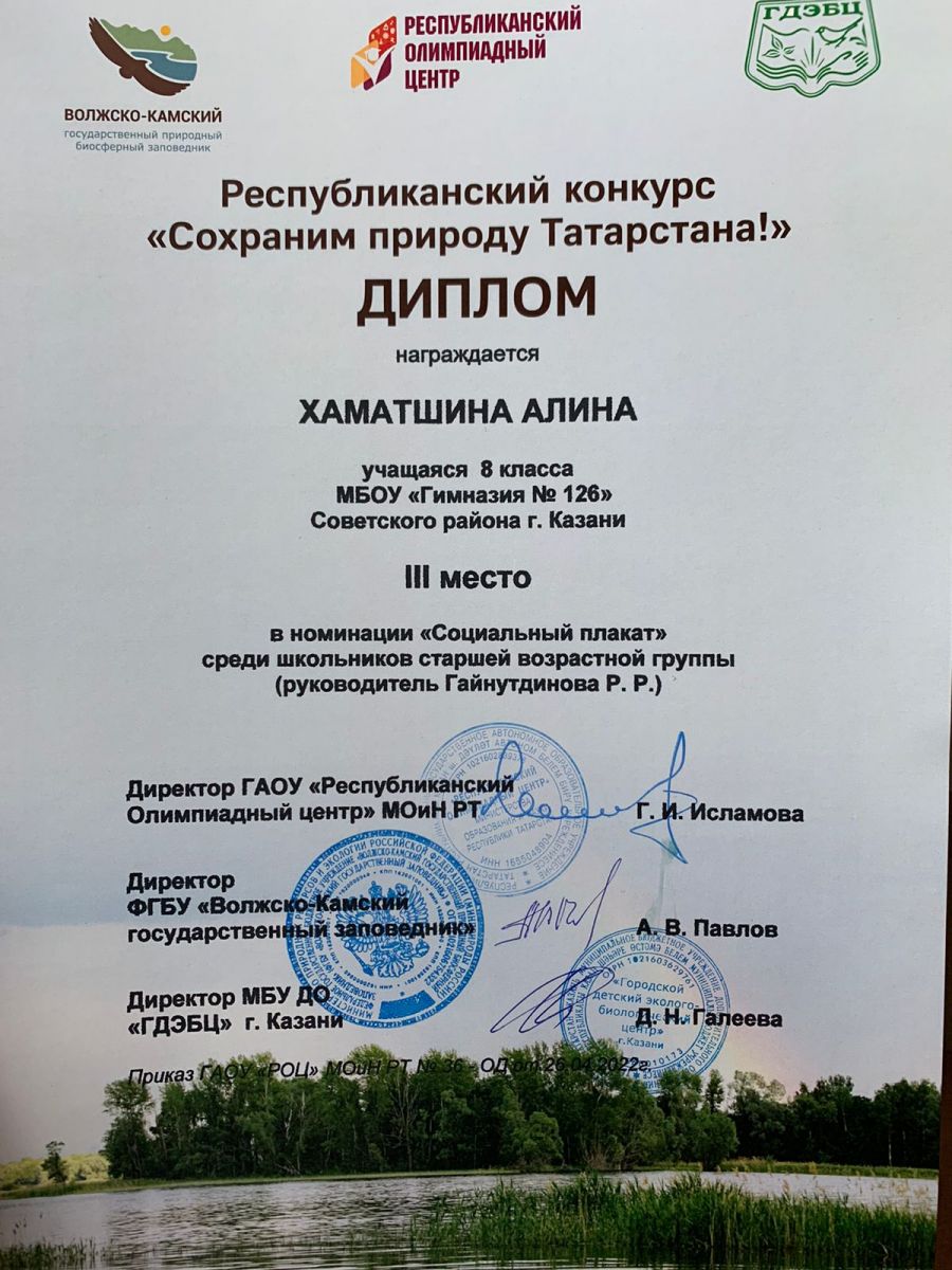 Поздравляем ученицу 8 А класса Хаматшину Алину Диплом III степени в Республиканском конкурсе "Сохраним природу Татарстана" в номинации "Социальный плакат". Благодарим за подготовку учителя биологии Гайнутдинову Резеду Рафаилевну. Желаем дальнейших успехов и побед.