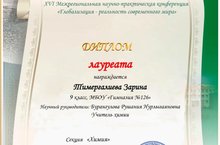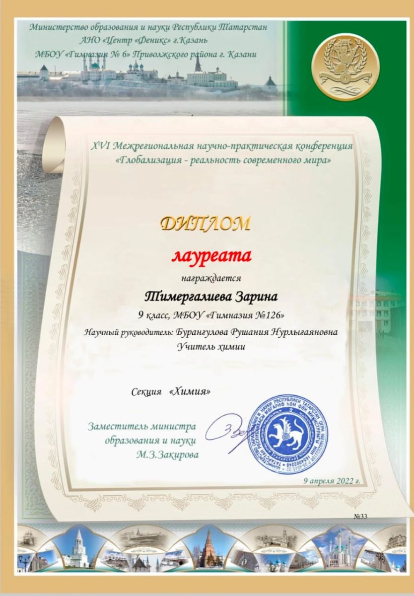 Диплом лауреата XVI Межрегиональной научно-практической конференции "Глобализация - реальность современного мира". Благодарим за подготовку учителя химии Бурангулову Рушанию Нурлыгаяновну. Желаем дальнейших успехов.