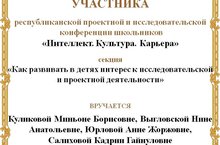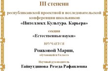 Поздравляем ученицу 8 Б класса, Рожкову Марию с успешным участием в Республиканской НПК. Благодарим за подготовку учителя биологии Гайнутдинову Резеду Рафаилевну. Диплом III степени в секции"Естественные науки". Желаем дальнейших успехов.