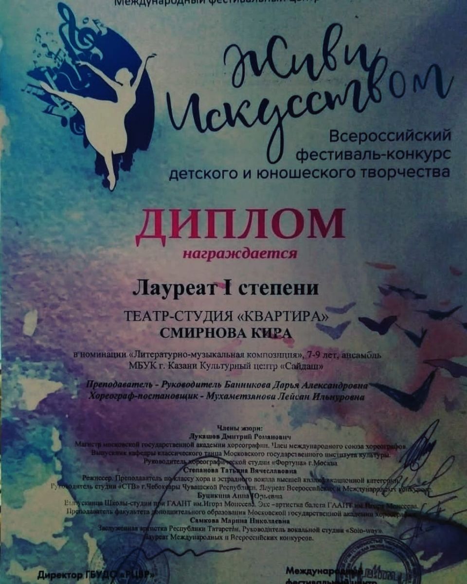 Поздравляем Смирнову Киру, ученицу 3Б класса с победой, I место во Всероссийском фестиваль-конкурсе детского и юношеского творчества "Живи искусством".