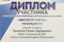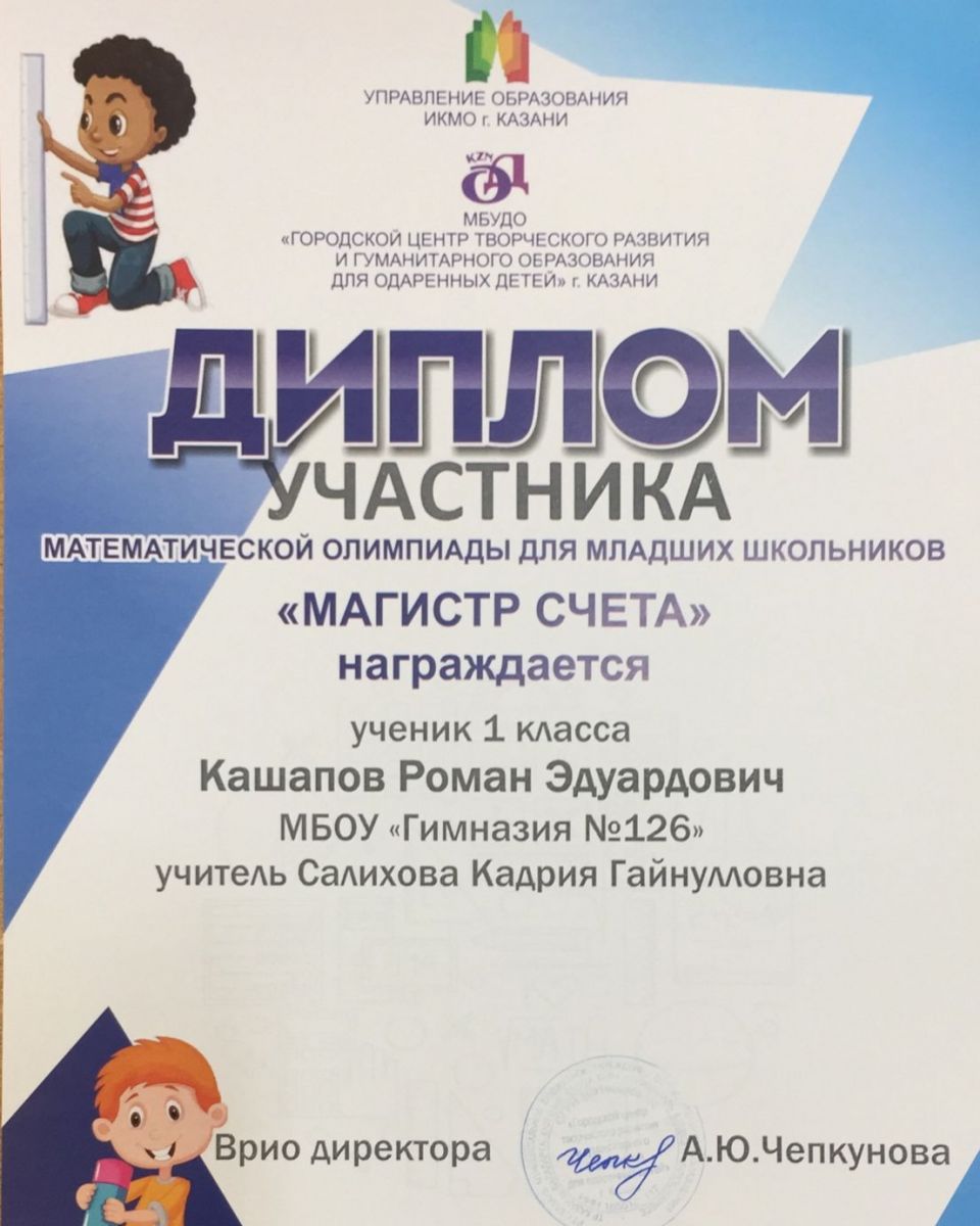 Поздравляем Кашапова Романа, ученика 1 А класса с первыми олимпиадными пробами