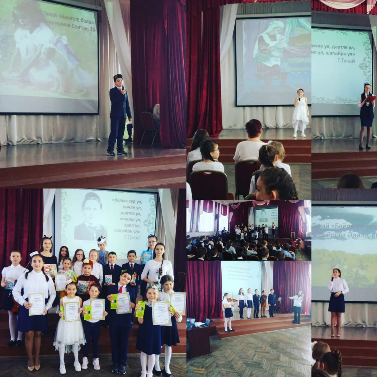 Мы празднуем 135-летие великого татарского поэта Г.Тукая. Сегодня в нашей гимназии, как и везде, Праздник стиха. На сцене призеры школьного этапа городского конкурса чтецов рассказали стихи Г.Тукая, призеры районного этапа городского конкурса татарских театральных коллективов показали спектакль "Дүрт дус". Праздник завершили коллективным исполнением песни "Туган тел".