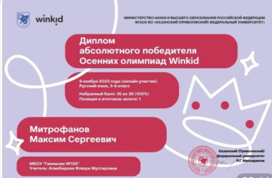 Диплом абсолютного победителя по русскому языку 16.11.2025
