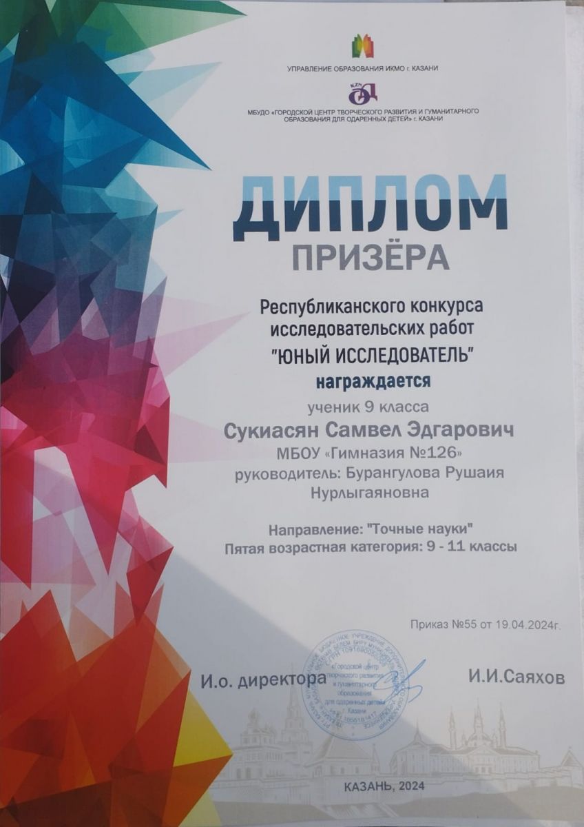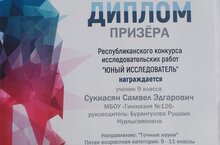 Поздравляем ученика 9Б класса, Сукиасяна Самвела с победой! Диплом Призера Республиканского конкурса исследовательских работ "Юный исследователь". Благодарим за подготовку учителя химии Бурангулову Рушанию Нурлыгаяновну. Желаем дальнейших успехов, научных открытий и творческих побед.