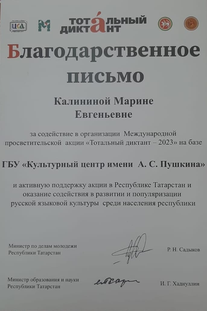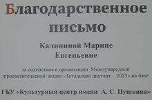 Поздравляем учителя русского языка и литературы, Калинину Марину Евгеньевну. Благодарственное письмо за содействие в организации Международной просветительской акции "Тотальный диктант". Благодарим за работу и желаем новых успехов и творческих побед.
