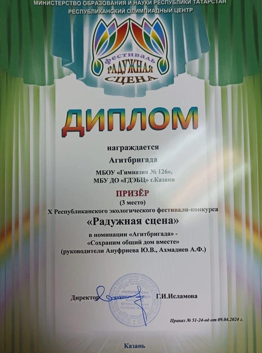 Поздравляем наших учащихся - победителей: Попову Веронику 9а, Шакирзянова Султана 6б, Шамсутдинову Сабину 6б, Пичугову Софью 6б, Архипову Полину 4б, Узбекову Нелю 4б, Туктарову Зарину 4б, Оразмырадову Альбину 8а, Попову Анжелику 5а, Волкова Артёма 4б, Мокеева Артура 4б, Камилову Самиру4б. Учащиеся нашей гимназит участники X Республиканского экологического фестиваля - конкурса "Радужная сцена". ПРИЗЁРЫ. Диплом III степени. Благодарим за организацию и подготовку педагогов Ахмадиева Азата Фаридовича, Ануфриеву Юлию Владимировну. Желаем дальнейших успехов и творческих побед.