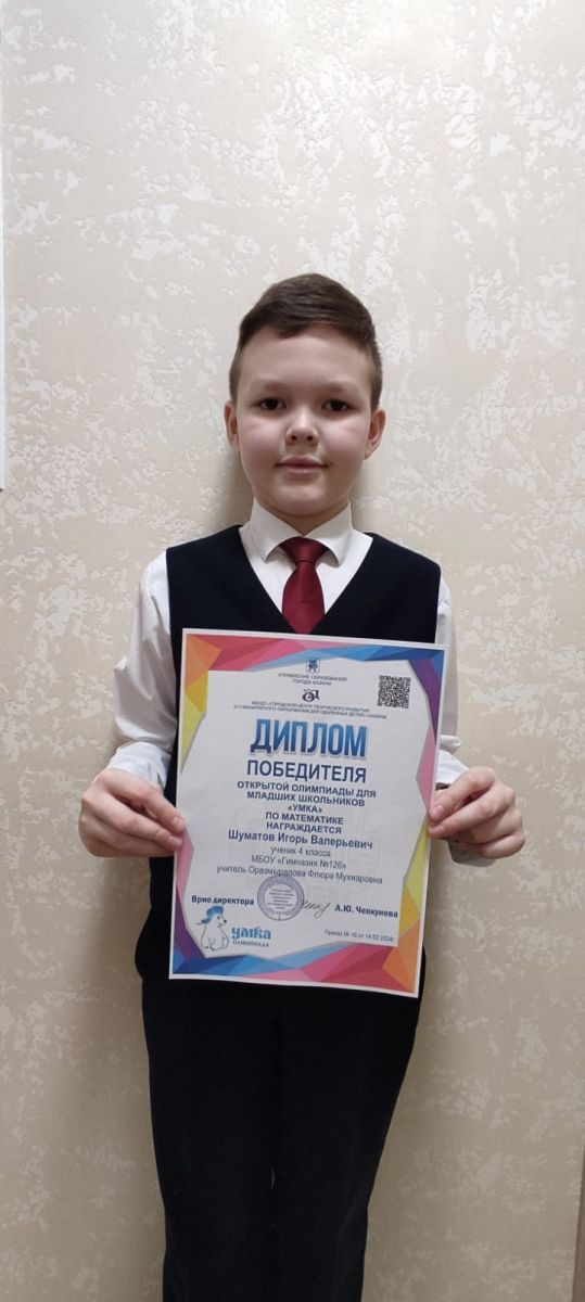 Поздравляем ученика 4Б класса, Шуматова Игоря, участника олимпиады по математике "Умка". Он победитель! Благодарим за подготовку учителя начальных классов, Оразмырадову Флюру Мухтаровну. Желаем дальнейших успехов и новых побед!