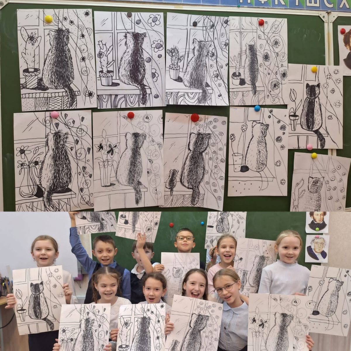 Учащиеся 3 А класса на занятиях артстудии работали маркером. Тема занятия "Кошка на окошке".