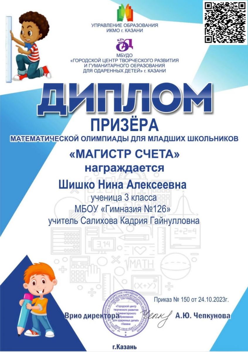 Поздравляем ученицу 3А класса, Шишко Нину с победой! Диплом Призера в математической олимпиаде для младших школьников. Благодарим за подготовку учителя начальных классов Салихову Кадрию Гайнулловну. Желаем дальнейших успехов и новых побед.