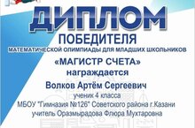 Поздравляем ученика 4 Б класса, Волкова Артёма с победой! Он ПОБЕДИТЕЛЬ математической олимпиады для младших школьников. Благодарим за подготовку учителя начальных классов Оразмырадову Флюру Мухтаровну. Желаем дальнейших успехов и новых побед.