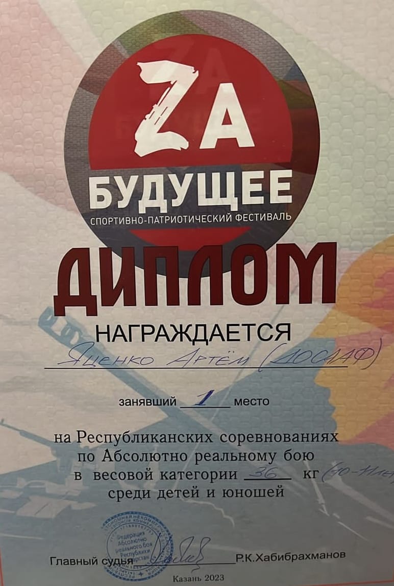 Поздравляем обучающегося 5А класса, Яценко Артёма! I место на Республиканский соревнованиях по Абсолютно реальному бою. Желаем дальнейших спортивных успехов и побед.
