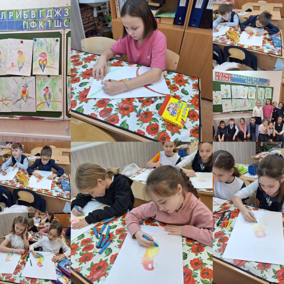 Попугаи — одни из самых популярных домашних животных. Они яркие, милые, переменчивые и забавные. Попугаи символизируют беззаботность, веселье и болтливость. На занятиях аrtстудии учащиеся 3А и 3Б классов восковыми мелками осваивали навык рисования попугаев.