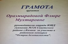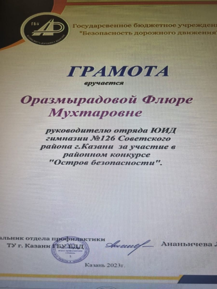 Поздравляем Оразмырадову Флюру Мухтаровну, руководителя отряды ЮИД 4 Б класса. Вручена грамота за участие в районном конкурсе "Остров безопасности". Благодарим за подготовку команды и желаем дальнейших побед.