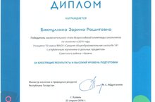 Очередным дипломом за блестящие результаты и высокий уровень подготовки награждена ученица 10А класса Бикмуллина Зарина, победитель заключительного этапа Всероссийской олимпиады школьников по экологии в 2016 г. Министр экологии и природных ресурсов Республики Татарстан Ф.С. Абдулганиев вручил этот диплом вместе с хрустальным именным знаком Победителя.