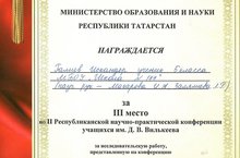 Поздравляем ученика 5в класса Галиева Искандера и ученицу 10 б класса Гарифуллину Алсу за успешное выступление во II Республиканской научно-практической конференции учащихся им. Д.В.Вилькеева, где они заняли III места. Руководители: Макарова И.А., Залялиева Л.Р., Курманова А.Ш. Желаем дальнейших успехов!