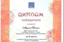 Модина Полина, ученица 4 «А» класса награждена дипломом победителя за 3 место в IV Всероссийском конкурсе детского творчества «ТАЛАНТ С КОЛЫБЕЛИ» Тема конкурса: «Чудесные мгновения фантазия и вдохновения» Направление: выразительное чтение и актёрское мастерство