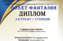 Поздравляем Сафаргулову Зарину с дипломом лауреата 1 степени Международного фестиваля искусства и творчества «Полет фантазии».
