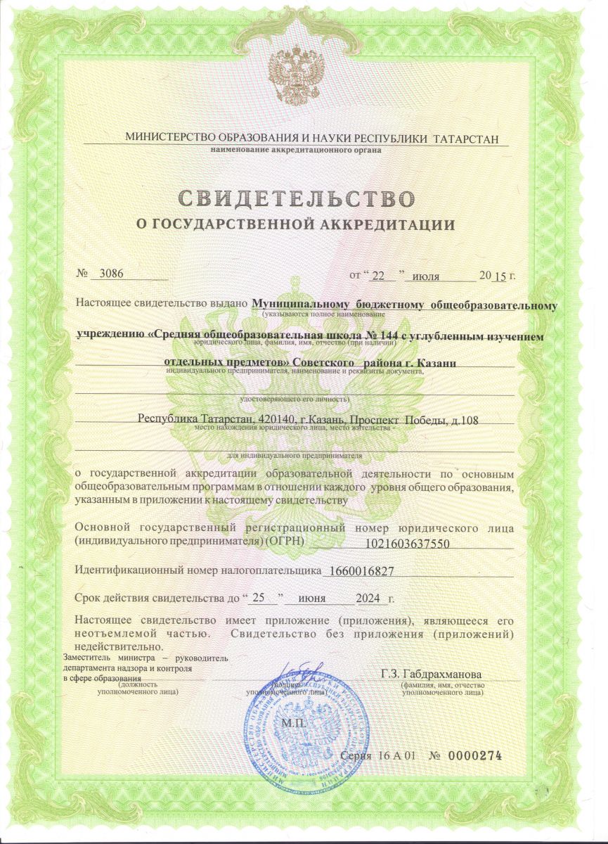 Муниципальное бюджетное общеобразовательное учреждение «Средняя общеобразовательная школа №144 с углубленным изучением отдельных предметов» Советского района г. Казани