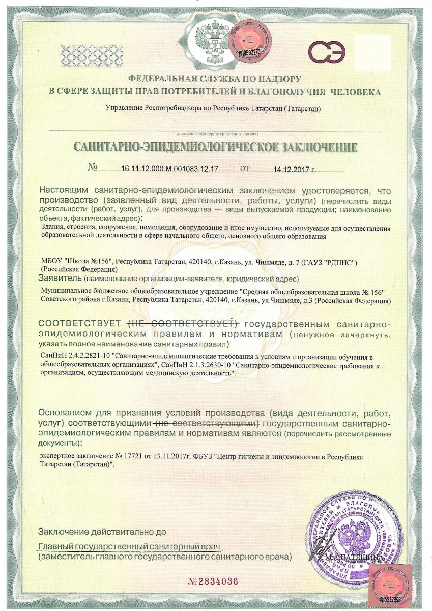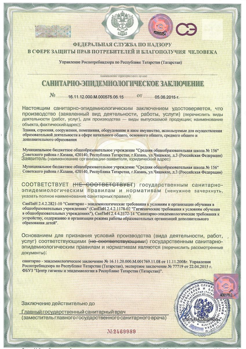 санитарно-эпидемиологическое заключение от 5 июня 2015, г. Казань, ул. Чишмяле, д.3