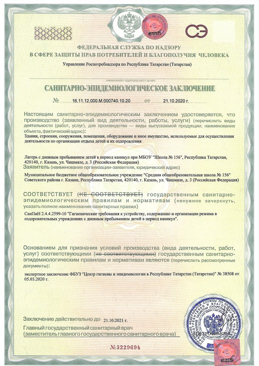 санитарно-эпидемиологическое заключение лагерь с дневным пребыватем детей от 21.10.2020