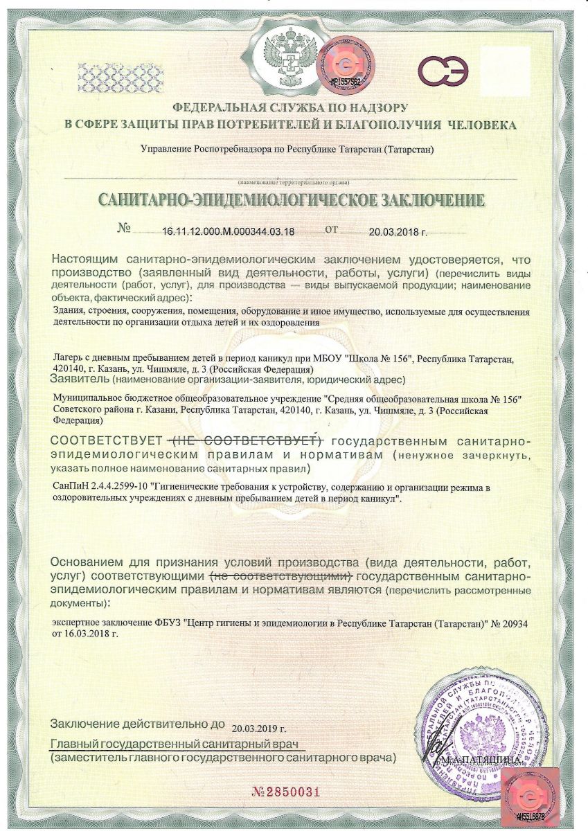 санитарно-эпидемиологическое заключение лагерь с дневным пребыватем детей от 20.03.2018