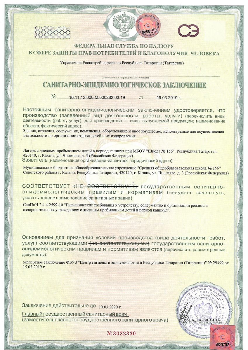 санитарно-эпидемиологическое заключение лагерь с дневным пребыватем детей от 19.03.2019
