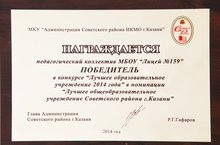 Коллектив МБОУ «Лицей №159» стали победителями районного конкурса «Лучшее образовательное учреждение 2014 года», утвержденного Главой администрации района в номинации «Лучшее общеобразовательное учреждение Советского района г. Казани»