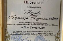 Стали известны итоги XVI ежегодного Всероссийского конкурса в области педагогики, воспитания и работы с детьми и молодежью "За нравственный подвиг". В региональном этапе приняла участие учитель начальных классов нашей школы Нуриева Гульнара Нурисламовна. Представив жюри свои методические разработки, продемонстрировав опыт работы и профессионализм, Гульнаре Нурисламовне удалось завоевать диплом III степени. Поздравляем нашу коллегу и желаем успехов на профессиональном поприще!