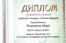 Стали известны итоги городского конкурса "Юный ведущий", организаторами которого являются Казанский институт культуры и Управление образования г. Казани. В нем принял участие ученик 9А класса нашей школы Розенталь Марк. Продемонстрировав членам жюри свою уверенность на сцене, свою харизму и свой талант, Марку удалось завоевать диплом лауреата II степени (конферанс на русском языке). Поздравляем юного конферасье, а также Хатыпову А. В., педагога, подготовивишего призера.
