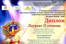 Подведены итоги VI открытого республиканского конкурса "Великая Победа - 2020". Ученице 2Б класса Колесник Владе удалось стать лауреатом II степени в номинации "Вокал-соло". Поздравляем Владу и желаем дальнейших успехов и побед! Благодарим за подготовку Красильникову Е. Е. и Ибрагимову Л. М.