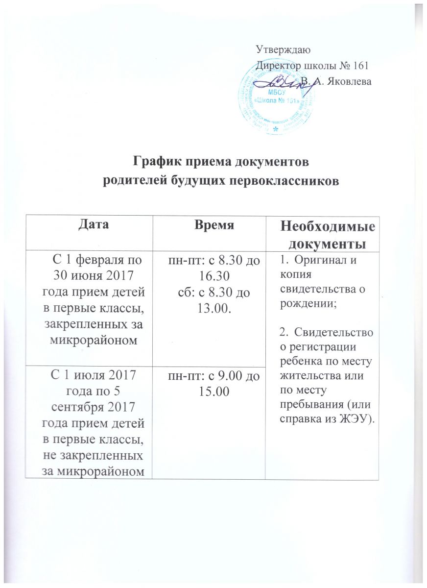 Вниманию родителейбудущих первоклассников!С 1 февраля по 30 июня 2017 года состоится прием детей в первые классы, закрепленных за микрорайоном.С 1 июля 2017 года и до момента заполнения свободных мест состоится прием детей в первые классы, не закрепленных за микрорайоном.Запись в 1 классы в приемной:пн-пт: с 9.00 до 16.00;сб: с 9.00 до 13.00.Необходимые документы:Оригинал и копия свидетельства о рождении;Свидетельство о регистрации ребенка по месту жительства или по месту пребывания (или справка из ЖЭУ).