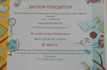 Поздравляем ученицу 4А класса Игнатову Алену и ее научного руководителя Батыршину М.Р. с 3 местом на межрегиональной олимпиаде по окружающему миру "Древо знаний" для 1-4 классов. Желаем дальнейших успехов!