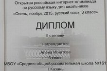 3А класс принял участие в Республиканской олимпиаде "Математический марафон". Игнатова Алена стала призером. Кроме того, Игнатова Алена получила диплом 2 степени в Открытой российской интернет-олимпиаде по русскому языку для школьников. Учитель: Батыршина М.Р.