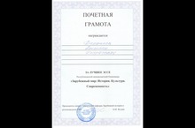Награждается Галиуллина Камилла, Победитель Республиканской межпредметной Олимпиады награждается «Зарубежный мир:История. Культурв. Современность». (Диплом III cтепени Института Международных Отношений).