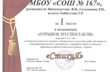 и педагога Хайбулловой Г.Р.занял первое место в номинации"Отрывок из спектакля". -