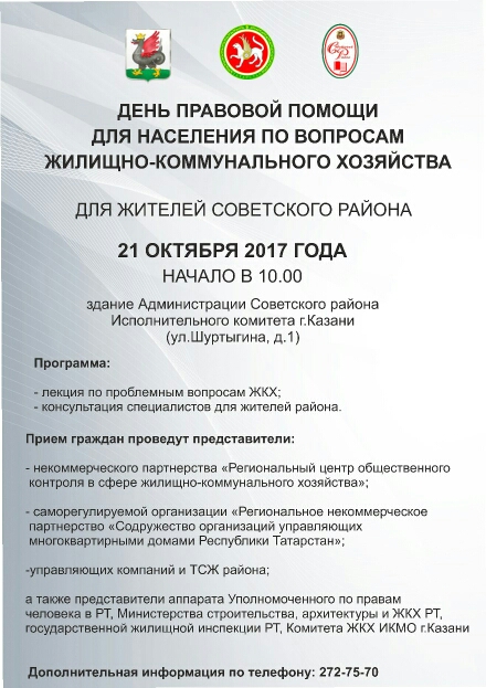 С целью оказания доступной и бесплатной юридической помощи населению, а также с целью правового просвещения граждан Уполномоченный по правам человека в Республике Татарстан совместно с некоммерческим партнерством «Региональный Центр общественного контроля в сфере жилищно-коммунального хозяйства», саморегулируемой организацией «Региональное некоммерческое партнерство «Содружество организаций управляющих многоквартирными домами Республики Татарстан», администрацией Советского района г. Казани проведут тематический День правовой помощи для жителей Советского района г. Казани по вопросам жилищно-коммунального хозяйства с приглашением представителей управляющих компаний.